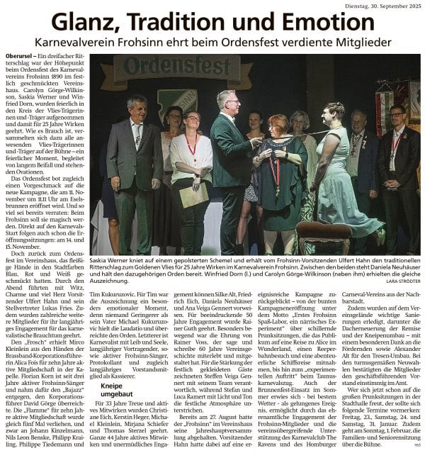 Der KV Frohsinn hat seine erste Jahreshauptversammlung seit 2019 abgehalten, teilten die Karnevaisten mit. Nachdem im vergangenen Jahr bedingt duch die Maßnamen gegen die Corona-Pandemie keine JHV habe stattfinden können...
